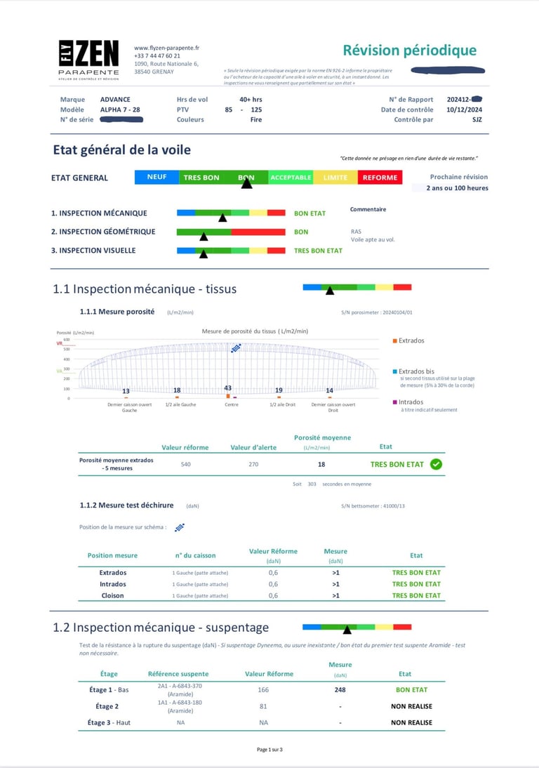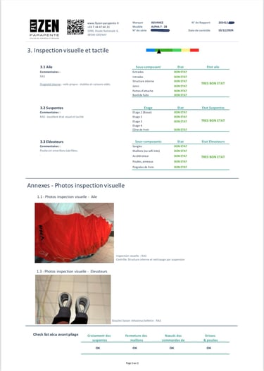 - Intégrité de la structure interne et des renforts de l'aile.Suspentes