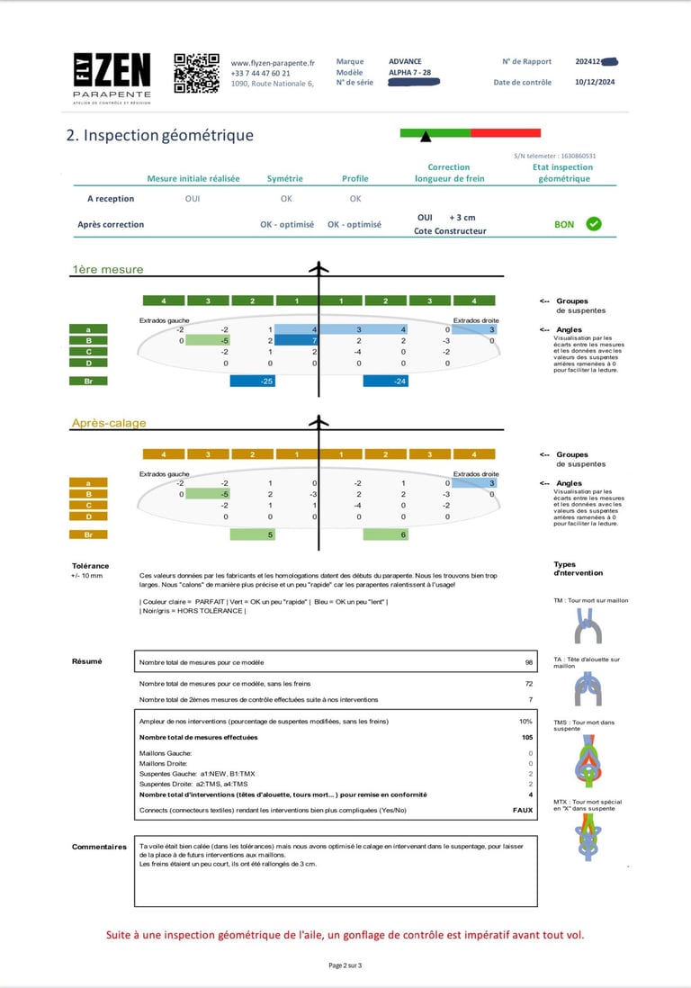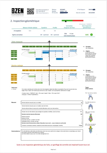 Si la mesure du calage de l'aile est hors tolérance : intervention dans le suspentage pour correspondre au calage fabricant.