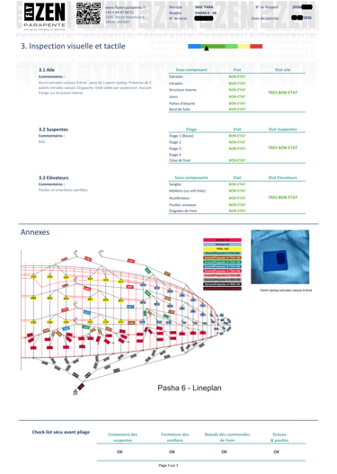 - Etat des pattes d'attache des suspentes,