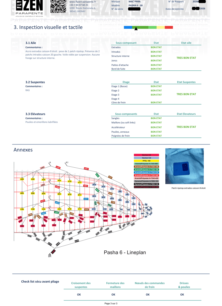 - Intégrité de la structure interne et des renforts de l'aile.Suspentes