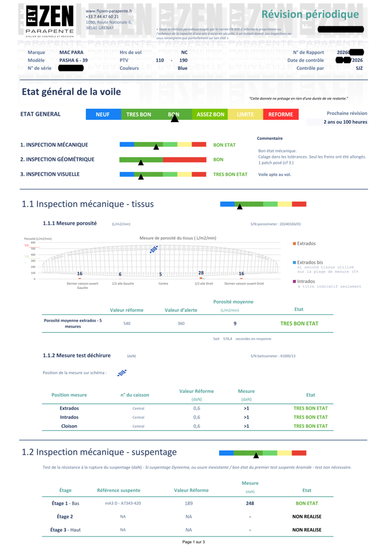 La valeur moyenne des 5 points sert de référence. La porosité du tissus de l'extrados ne doit pas dépasser une valeur seuil de 540 L/m2/min.