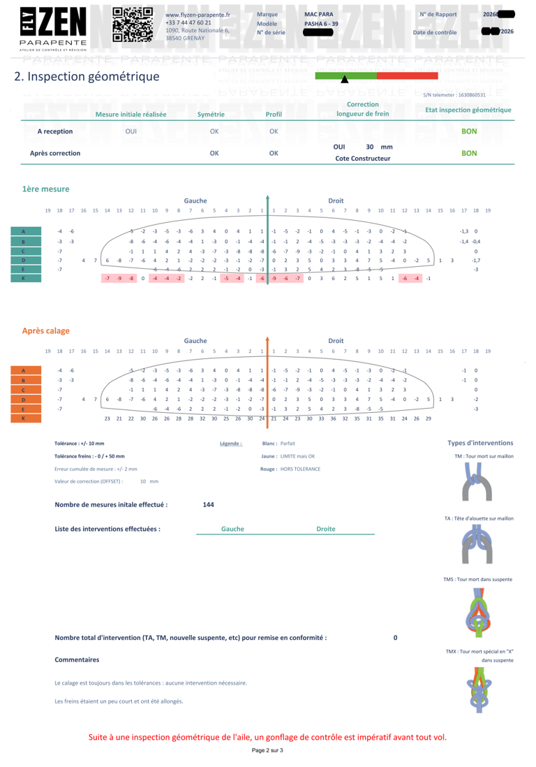 Si la mesure du calage de l'aile est hors tolérance : intervention dans le suspentage pour correspondre au calage fabricant.